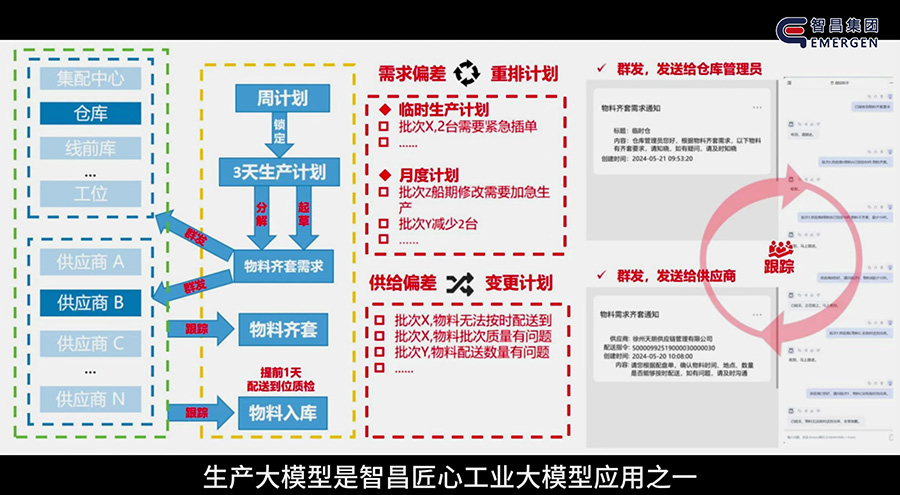在物料齊套環(huán)節(jié),智昌集團部署基于智昌匠心工業(yè)大模型的智能體工作流,替代傳統(tǒng)人工的信息匯總、供應商溝通及物流跟蹤等復雜操作,結合RPA技術實現(xiàn)全流程自動化,顯著提升齊套率并降低人力成本。